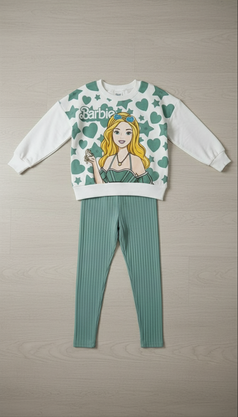 Üst kısmında dikkat çekici Barbie yazısı ve kalp detayları bulunur. Alt kısmı ise fitilli yeşil tayt formundadır; esnek yapısı sayesinde gün boyu rahat hareket imkânı sağlar. Yumuşacık dokusu ile çocukların hassas cildine dosttur ve hem evde hem dışarıda kullanım için idealdir.