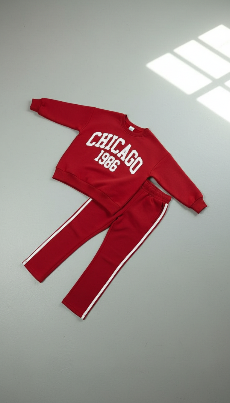 Enerjik tarzı ve retro havasıyla dikkat çeken Chicago 1986 Baskılı Kız Çocuk Kırmızı İspanyol Paça Alt Üst Takım, miniklerin dolabına şehir stilini taşıyor! 🔴 Kırmızı rengin dinamizmini, rahat kesimli sweatshirt ve geniş paçalı alt parça ile buluşturan bu takım, hem konforlu hem de stil sahibi bir görünüm sunar.