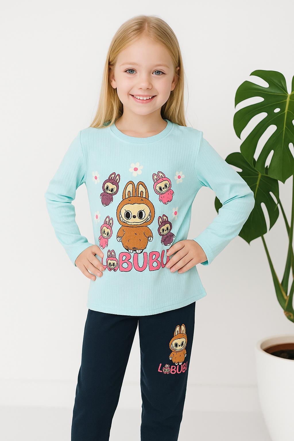 Labubu Baskılı Kız Çocuk Fitilli Turkuaz Alt Üst Takım (5-8 Yaş)