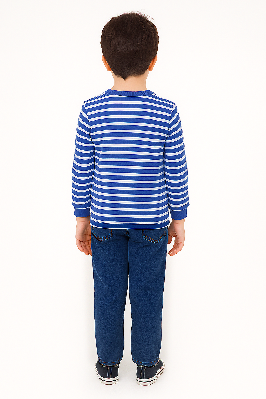 Minik beylerin enerjik tarzına uygun olarak tasarlanan Sevimli Köpek Baskılı Sweat, lacivert üzerine çizgili deseni ve eğlenceli köpek baskısıyla dikkat çekiyor. Modern görünümü ve konforlu yapısıyla çocukların gardırobuna hem şıklık hem de rahatlık katıyor.